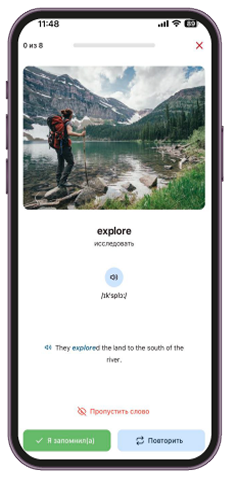 • Система интервальных повторений: 7-кратные индивидуальные напоминания для повтора каждого слова, чтобы оно сохранилось в памяти навсегда